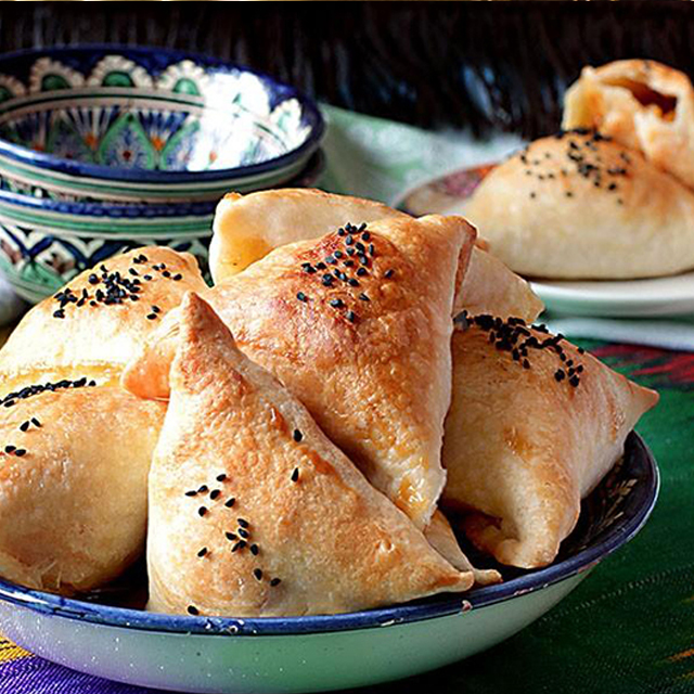 1Tender wrappers stuffed with ground beef or spinach & seasoning. Deep fried to crispy