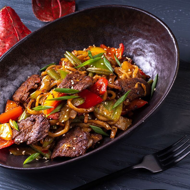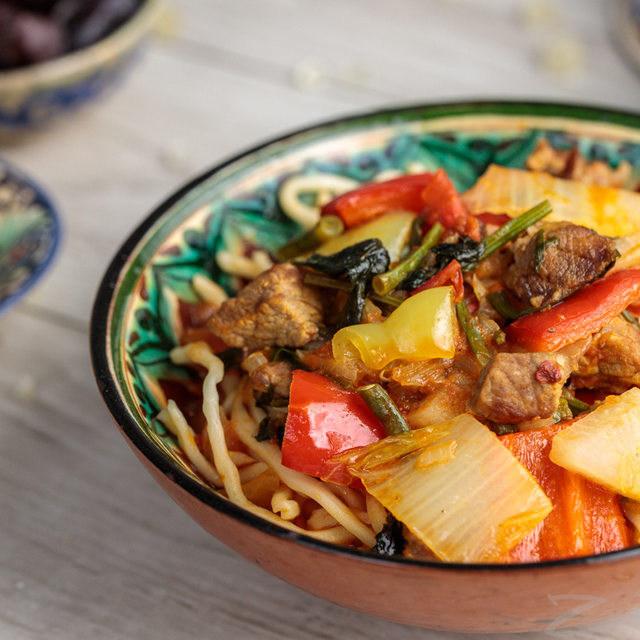 1Sweet potato starch noodles with stir fried beef, vegetables and brown rise red pepper paste